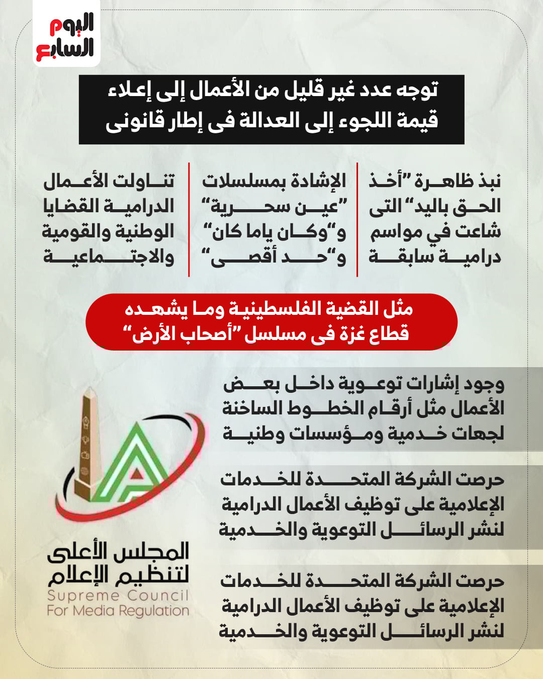وأوضحت اللجنة توجه عدد غير قليل من الأعمال إلى إعلاء قيمة اللجوء إلى العدالة في إطار قانوني، بعد أن كانت ظاهرة “أخذ الحق باليد” قد شاعت في مواسم درامية سابقة، مثل مسلسلات “عين سحرية” و”الست موناليزا” و”وكان ياما كان” و”حد أقصى”، كما تناولت الأعمال موضوعات إنسانية واجتماعية كبيرة بشكل مبسط وقريب من الجمهور، مثل قيم العدل والحق والترابط الأسري.