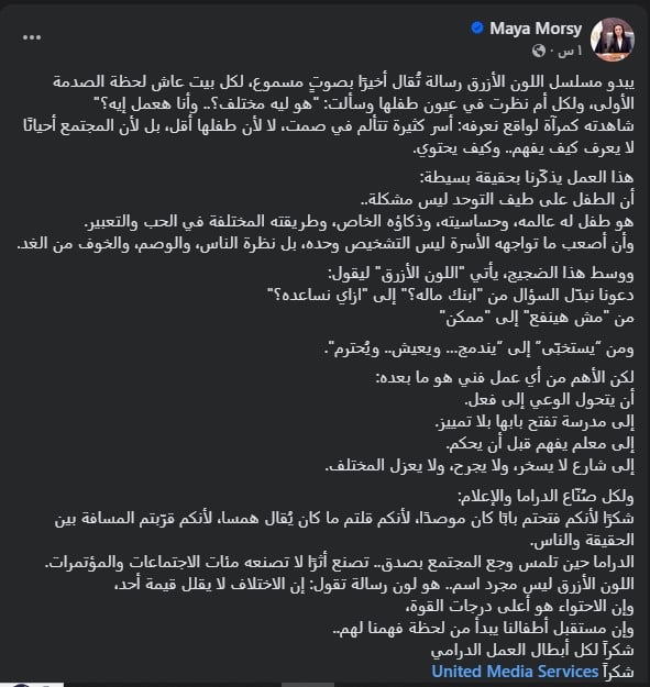 أشادت الدكتورة مايا مرسي وزيرة التضامن الاجتماعي ، بالعمل الدرامي اللون الأزرق ، مؤكدة أنه يقدم رسالة إنسانية مهمة تعكس واقع العديد من الأسر التي تعيش تجربة تربية طفل على اضطراب طيف التوحد، ويسلط الضوء على التحديات التي تواجه هذه الأسر داخل المجتمع.