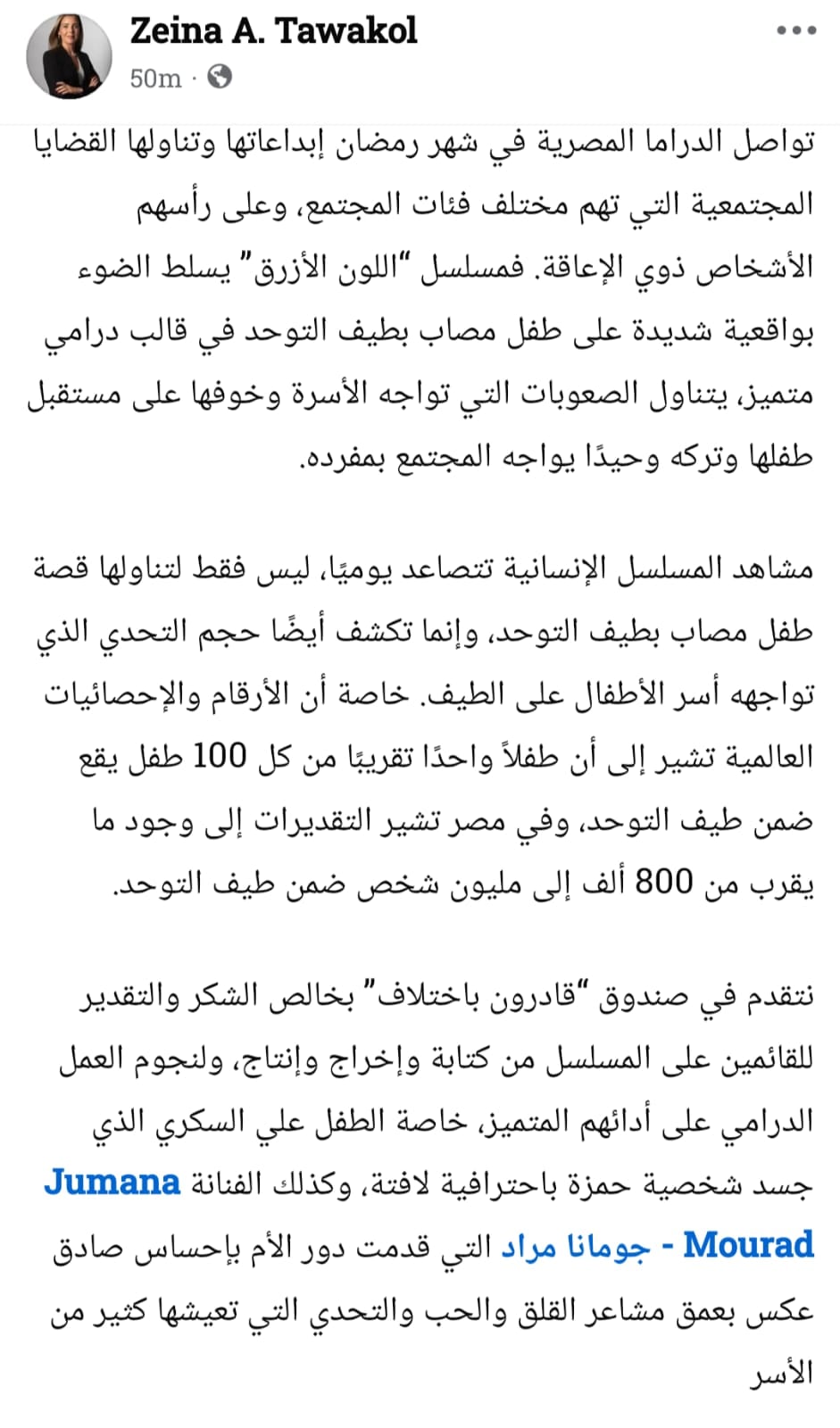 وجاءت الإشادة على لسان زينة توكل المديرة التنفيذية لصندوق قادرون باختلاف، التي أكدت أن المسلسل قدم معالجة درامية إنسانية واقعية لقضية طيف التوحد، في إطار درامي مؤثر يسلط الضوء على الصعوبات النفسية والاجتماعية التي تعيشها الأسر.