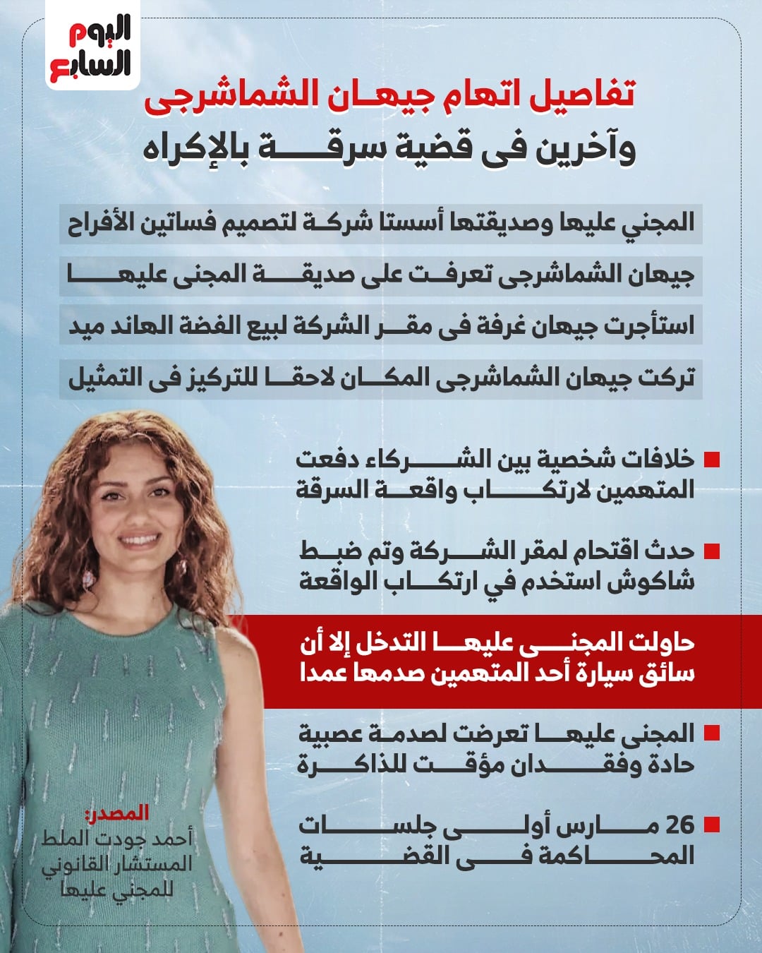 وأعد "اليوم السابع" انفوجراف يتضمن تفاصيل الاتهامات المنسوبة للفنانة جيهان الشماشرجي بالسرقة بالإكراه والتسبب في إصابة سيدة وهى: