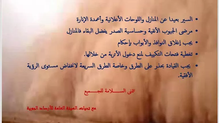 ودعت "الهيئة" المواطنين إلى اتخاذ الاحتياطات اللازمة للحفاظ على سلامتهم، ومنها الابتعاد عن المنازل واللوحات الإعلانية وأعمدة الإنارة، وبقاء مرضى الجيوب الأنفية وحساسية الصدر في المنازل، وإغلاق النوافذ والأبواب بإحكام، وتغطية فتحات التكييف لمنع دخول الأتربة.
