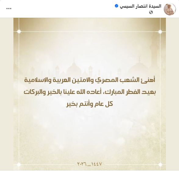 وقالت السيدة انتصار، عبر صفحتها الرسمية على فيسبوك: "أهنئ الشعب المصري والأمتين العربية والإسلامية بعيد الفطر المبارك، أعاده الله علينا بالخير والبركات.. كل عام وأنتم بخير".