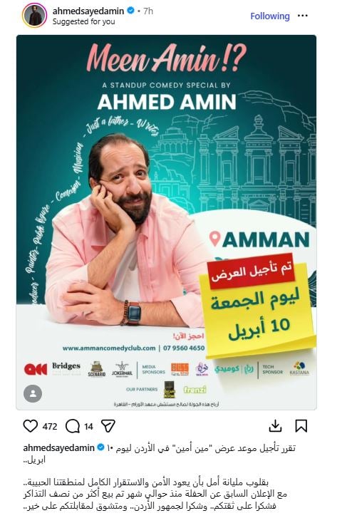 وكتب أحمد أمين عبر حسابه على "انستجرام" قائلاً: "تقرر تأجيل موعد عرض "مين أمين" في الأردن ليوم 10 ابريل، بقلوب مليانة أمل بأن يعود الأمن والاستقرار الكامل لمنطقتنا الحبيبة، مع الإعلان السابق عن الحفلة منذ حوالي شهر تم بيع أكثر من نصف التذاكر فشكرا على ثقتكم؟، وشكرا لجمهور الأردن، ومتشوق لمقابلتكم على خير".
