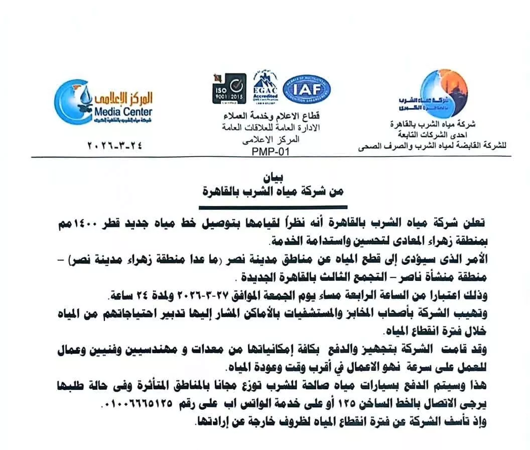 أعلنت شركة مياه الشرب بالقاهرة، أنه سيتم قطع المياه عن مناطق مدينة نصر باستثناء مناطق ( زهراء مدينة نصر، منشأة ناصر، والتجمع الثالث بالقاهرة الجديدة)، وذلك يوم الجمعة الموافق 27-3-2026، اعتبارًا من الساعة 4 مساءً ولمدة 24 ساعة.