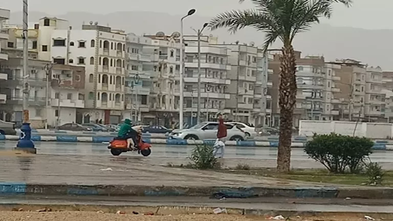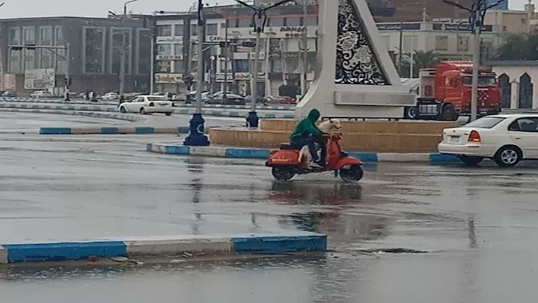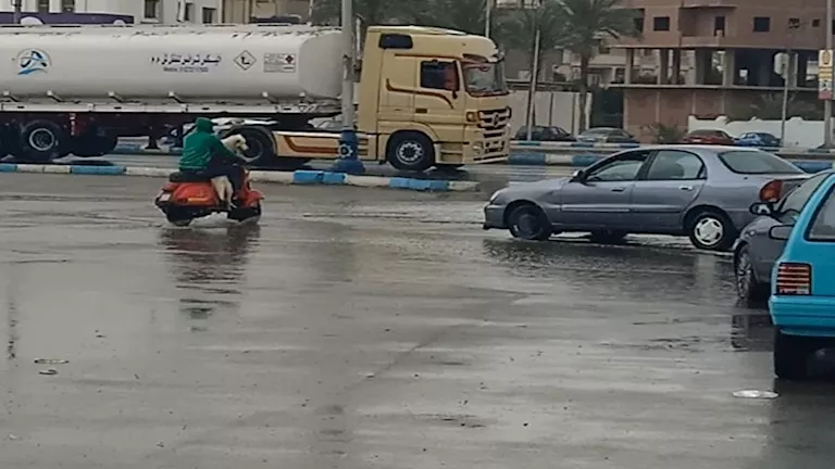 وسط الأمطار الغزيرة خرج شاب أصطحب رفيقه الأليف في جولة بمدينة السلام التابعة لمحافظة السويس مستقلا " فيسبا" يتنقل به وهو يتفادى أماكن تجمعات المياه وسط الودق المنهمر فوق رأسه ورفيقه.