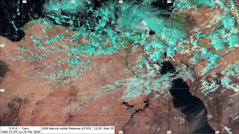كما أشارت إلى استمرار تدفق السحب الرعدية الممطرة على شمال البلاد، تمتد إلى القاهرة الكبرى ومدن القناة ومناطق من سيناء وشمال الصعيد، وتكون مصحوبة أحيانًا بسقوط حبات البرد.