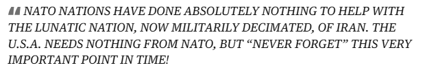 وكتب بأحرف إنجليزية كبيرة – فى إشارة للغضب: دول الناتو لم تفعل شيئًا يُذكر لمساعدة إيران، هذه الدولة المجنونة التي أصبحت الآن مُنهكة عسكريًا. الولايات المتحدة لا تحتاج شيئًا من الناتو، ولكن "لا تنسوا أبدًا" هذه اللحظة الفارقة!