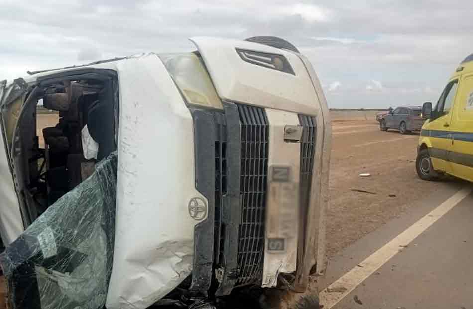 أصيب 8 أشخاص؛ بسبب حادث انقلاب ميكروباص أعلى الطريق الأوسطى باتجاه حلوان.