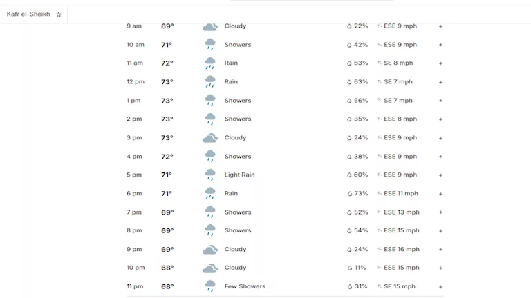 تستعد محافظة كفر الشيخ غداً الأربعاء، الأول من أبريل 2026، لاستقبال موجة من التقلبات الجوية تتضمن سقوط أمطار متفاوتة الشدة على فترات متقطعة، وذلك بحسب البيانات التفصيلية لموقع "Weather.com" العالمي، والتي رصدت ملامح الخريطة الزمنية للهطول بدقة على مدار اليوم.