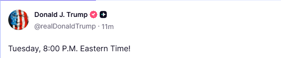حدد الرئيس الأمريكي دونالد ترامب موعد انتهاء الإنذار الموجه إلى السلطات الإيرانية لفتح مضيق هرمز من خلال تدوين له كتب فيها: الثلاثاء، الساعة 8:00 مساءً بتوقيت شرق الولايات المتحدة، دون ذكر أي شيء أخر.