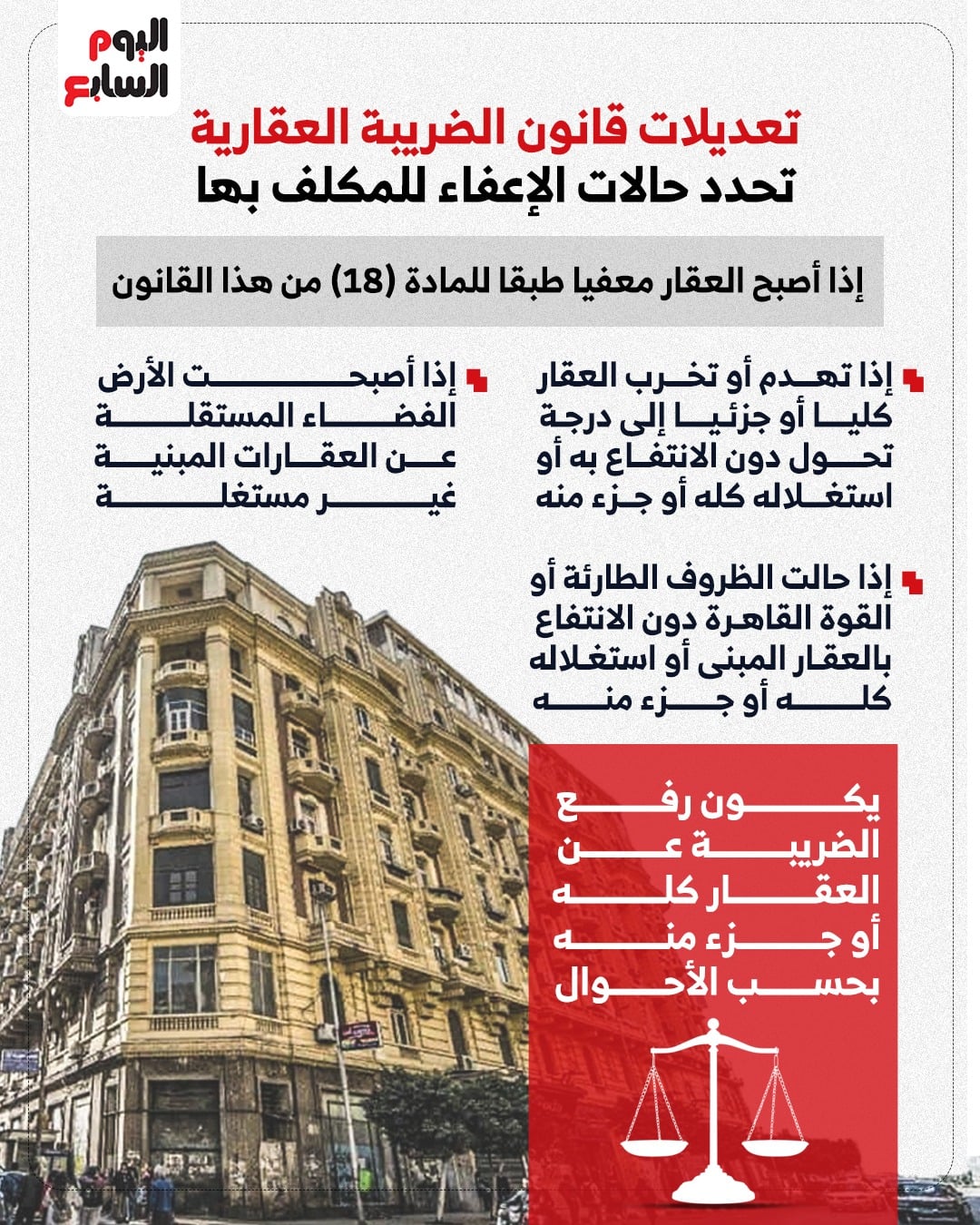 (أ) إذا أصبح العقار معفيا طبقا للمادة (۱۸) من هذا القانون . (ب) إذا تهدم أو تخرب العقار كليا أو جزئيا إلى درجة تحول دون الانتفاع به أو استغلاله كله أو جزء منه . (ج) إذا أصبحت الأرض الفضاء المستقلة عن العقارات المبنية غير مستغلة (د) إذا حالت الظروف الطارئة أو القوة القاهرة دون الانتفاع بالعقار المبني أو استغلاله كله أو جزء منه . ويكون رفع الضريبة عن العقار كله أو جزء منه بحسب الأحوال.