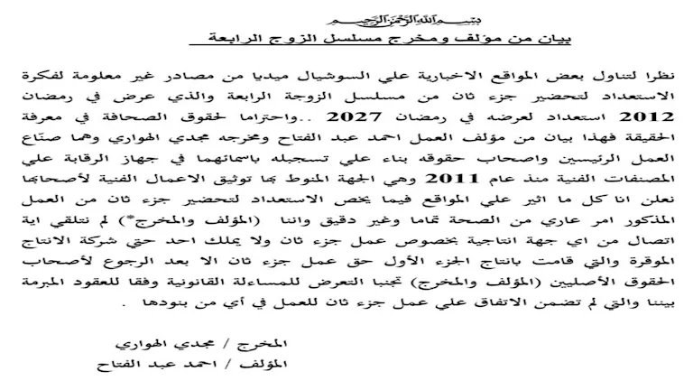 وجاء في البيان "نظرا لتناول بعض المواقع الإخبارية على السوشيال ميديا من مصادر غير معلومة لفكرة الاستعداد لتحضير جزء ثان من مسلسل الزوجة الرابعة، والذي عرض في رمضان 2012 استعدادا لعرضه في رمضان 2027، واحتراما لحقوق الصحافة في معرفة الحقيقة فهذا بيان من مؤلف العمل أحمد عبدالفتاح ومخرجه مجدي الهواري، وهما صناع العمل الرئيسيين وأصحاب حقوقه بناء على تسجيله باسميهما في جهاز الرقابة على المصنفات الفنية منذ عام 2011، وهي الجهة المنوط بها توثيق الأعمال الفنية لأصحابها. نعلن أن كل ما أثير على المواقع فيما يخص الاستعداد لتحضير جزء ثان من العمل المذكور أمر عاري من الصحة تماما وغير دقيق".