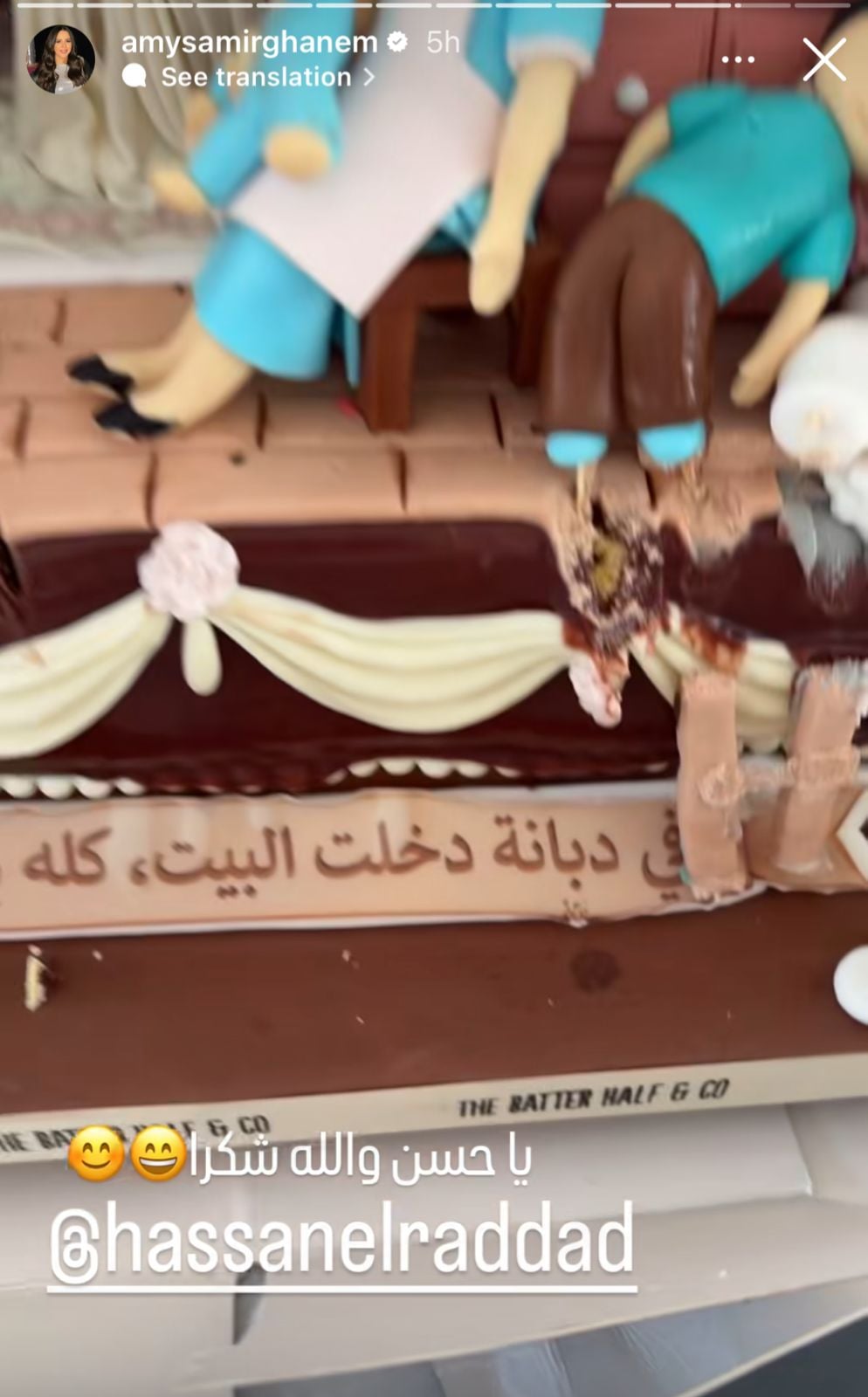 وفي لفتة مميزة، احتفل الفنان حسن الرداد بعيد ميلاد زوجته بطريقة مختلفة، حيث صمّم لها تورتة خاصة، كتب عليها: "في دبانة دخلت البيت كله بجيلي حالا"، وهي من الجمل الشهيرة المرتبطة بإيمي، ما أضفى أجواءً من المرح على الاحتفال.
