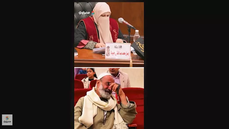 وأضاف أن سير المناقشة كان طبيعيًا في بدايته، إلا أن فريق التصوير لاحظ تأثر والد الباحثة طوال الجلسة، وظهور علامات الانفعال عليه أثناء حديث ابنته، قبل أن تتصاعد المشاعر بشكل واضح في لحظة توجيه الشكر.