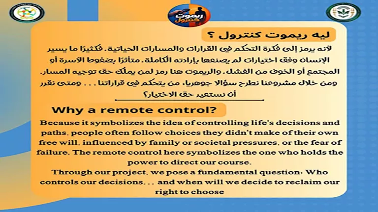 اختارت الطالبات اسم ريموت كنترول كرمز يعبر عن التحكم في القرارات، حيث يشير إلى واقع يعيشه كثيرون يسيرون وفق اختيارات لم يصنعوها بإرادتهم الكاملة، متأثرين بضغوط الأسرة أو المجتمع أو الخوف من الفشل، ويطرح المشروع تساؤلًا جوهريًا: من يتحكم في قراراتنا؟ ومتى نقرر أن نستعيد حق الاختيار؟