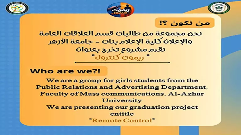 قدمت مجموعة من طالبات قسم العلاقات العامة والإعلان مشروعًا مميزًا بعنوان: "ريموت كنترول"، يطرح رؤية فكرية وإنسانية حول مفهوم حرية الاختيار وتأثير الضغوط المجتمعية على قرارات الأفراد ومساراتهم الحياتية، في إطار مشروعات التخرج بكلية الإعلام بنات - جامعة الأزهر.