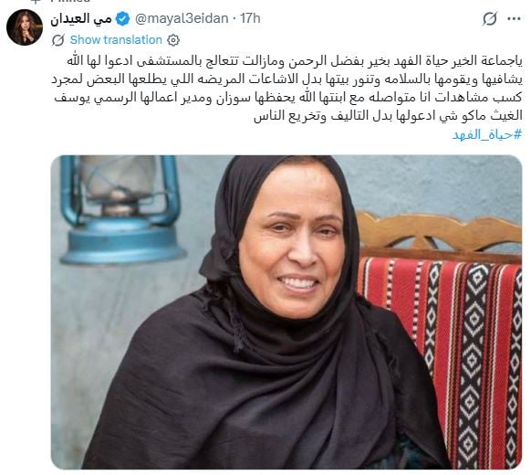 نفت الإعلامية الكويتية مي العيدان ما تردد خلال الساعات الأخيرة بشأن وفاة النجمة الكويتية حياة الفهد ، حيث كتبت عبر حسابها على "إكس": "يا جماعة الخير حياة الفهد بخير بفضل الرحمن وما زالت تتعالج بالمستشفى ادعوا لها الله يشفيها ويقومها بالسلامة وتنور بيتها بدل الأشعات المريضة اللي يطلعها البعض لمجرد كسب مشاهدات، أنا متواصلة مع ابنتها الله يحفظها سوزان ومدير أعمالها الرسمي يوسف الغيث، ادعو لها بدل التأليف وتخريع الناس".