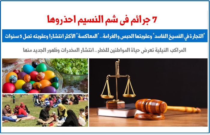 رصد موقع "برلماني"، المتخصص في الشأن التشريعى والنيابى، في تقرير له تحت عنوان: "7 جرائم فى شم النسيم احذروها.. أبرزها بيع الفسيخ الفاسد"، حيث تشهد العاصمة القاهرة، منذ صباح اليوم، استنفارا أمنيا للقوات وانتشارا مكثفا للخدمات الأمنية وعناصر الشرطة النسائية بالمتنزهات النيلية والحدائق العامة لتأمين المواطنين خلال احتفالات شم النسيم، حيث تشهد جميع محافظات المجهورية من الأجهزة المعنية، تفقد الخدمات بالميادين والمتنزهات والحدائق العامة بالعاصمة للوقوف على الحالة الأمنية بالمناطق التي يرتادها المواطنين خلال احتفالاتهم بشم النسيم، وتفقد مناطق الحدائق والمنتزهات ووسط البلد وكورنيش النيل والمراسي النيلية .