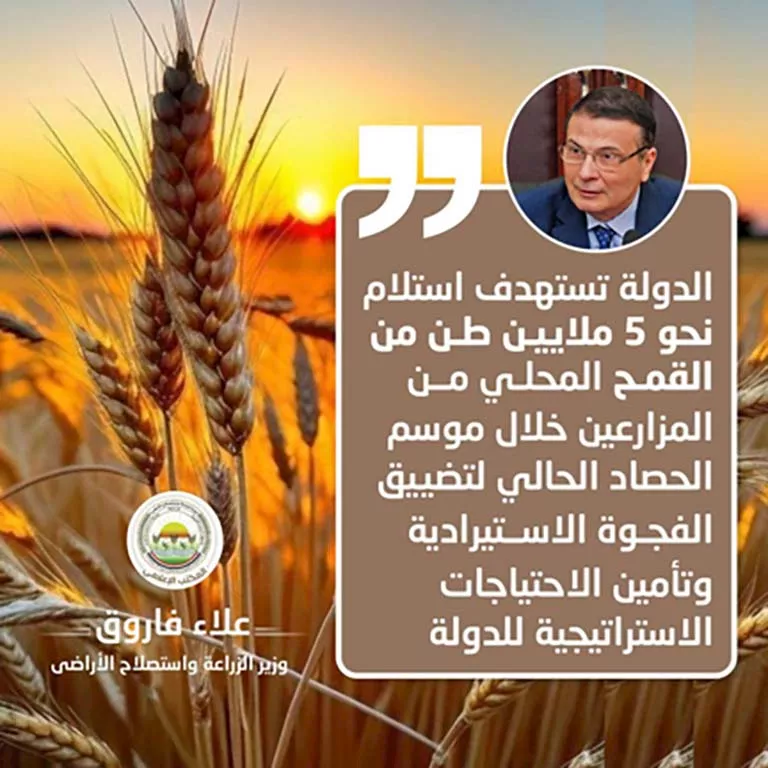 وأكد علاء فاروق، وزير الزراعة واستصلاح الأراضي، أن الدولة تستهدف استلام نحو 5 ملايين طن من القمح المحلي من المزارعين خلال موسم الحصاد الحالي، بما يسهم بشكل مباشر في تضييق الفجوة الاستيرادية وتأمين الاحتياجات الاستراتيجية للدولة.