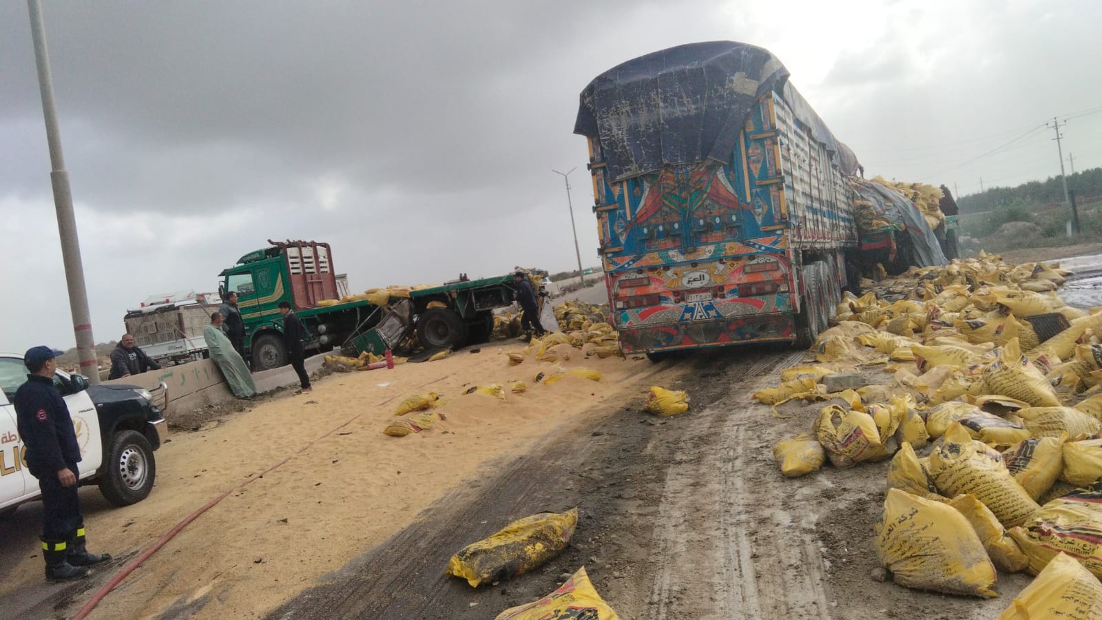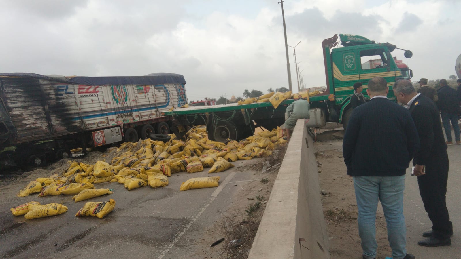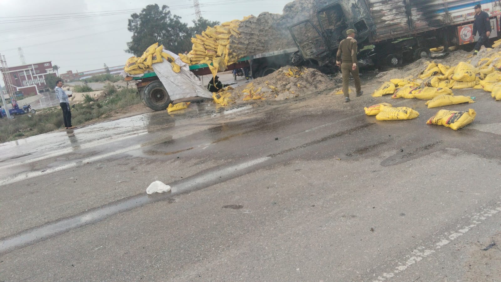 تلقت غرفة النجدة بلاغا من الأهالي بحدوث حريق بسيارتين نقل، وهرعت سيارات الدفاع المدني، لموقع الحادث، تبين نشوب حريق بسيارة محملة بفول الصويا على الطريق الدولى الساحلى، عقب تصادم بين سيارتين نقل (لوري)، إحداهما محملة بشكاير فول صويا وقد اشتعلت بها النيران، والأخرى محملة بشكاير مُحسّن زراعي.