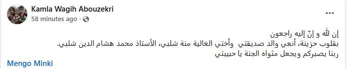 حرصت المخرجة كاملة أبو ذكري على نعي الفقيد، حيث كتبت: "إنا لله وإنا إليه راجعون، بقلوب حزينة أنعي والد صديقتي وأختي الغالية منة شلبي، الأستاذ محمد هشام الدين شلبي، ربنا يصبركم ويجعل مثواه الجنة".