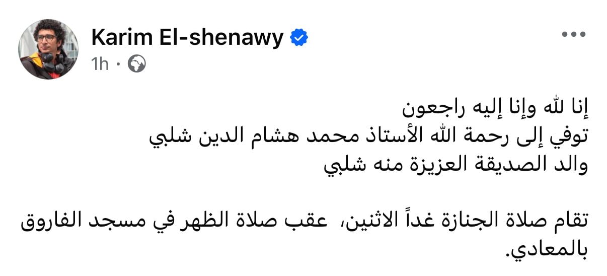 نعى المخرج كريم الشناوي والد الفنانة منة شلبي بكلمات مؤثرة، حيث كتب: "إنا لله وإنا إليه راجعون"، توفي إلى رحمة الله الأستاذ محمد هشام الدين شلبي والد الصديقة العزيزة منة شلبي
