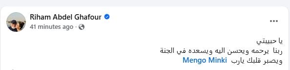 كما نعت الفنانة ريهام عبد الغفور الفقيد بكلمات مؤثرة، قائلة: "يا حبيبتي ربنا يرحمه ويحسن إليه ويسعده في الجنة، ويصبر قلبك يا رب".