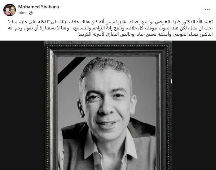 وأضاف شبانة: «وهنا لا يسعنا إلا أن نقول رحم الله الدكتور ضياء العوضي وأسكنه فسيح جناته، وخالص التعازي لأسرته الكريمة»، مؤكدًا أن مثل هذه اللحظات تفرض احترام قيمة الإنسان وتدعو إلى تجاوز أي خلافات سابقة.