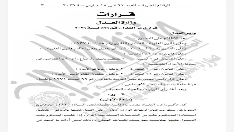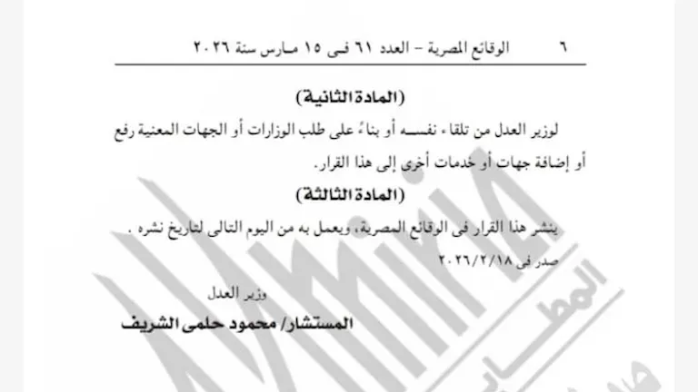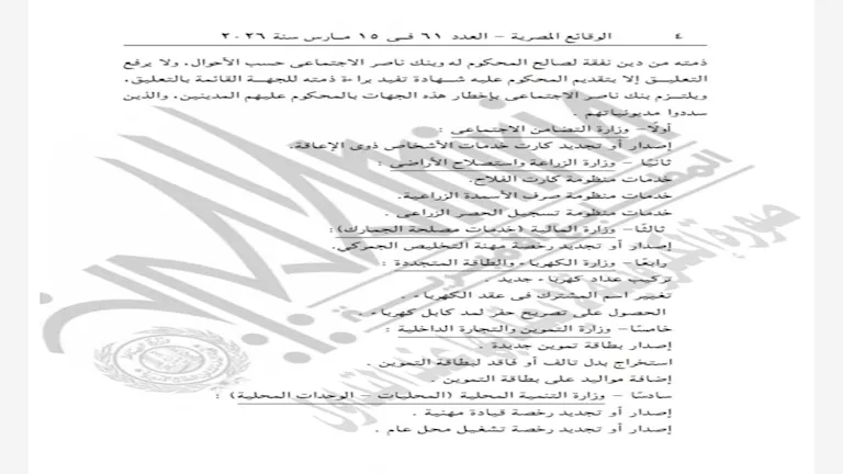 ويُلزم القرار الجهات المعنية بتطبيق التعليق فور وصول إخطار من بنك ناصر الاجتماعي بأسماء المحكوم عليهم، مع رفع التعليق بعد تقديم شهادة براءة الذمة، ويُعمل به من اليوم التالي لنشره في الوقائع المصرية.