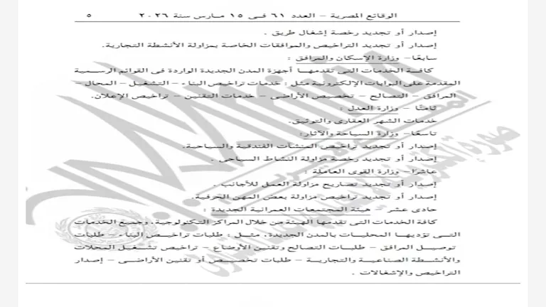 الإسكان والمجتمعات العمرانية: تعليق تراخيص البناء والتشغيل، تخصيص الأراضي وتقنين الأوضاع، وتوصيل المرافق والخدمات.