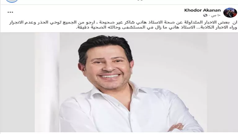 وكتب خضر: "إن بعض الأخبار المتداولة عن صحة الأستاذ هاني شاكر غير صحيحة، أرجو من الجميع توخي الحذر وعدم الانجرار وراء الأخبار الكاذبة… الأستاذ هاني ما زال في المستشفى وحالته الصحية دقيقة".