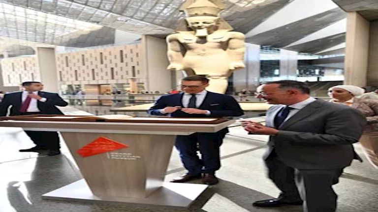 كان في استقبالهم بالمتحف المصري الكبير، الدكتور أحمد غنيم، الرئيس التنفيذي لهيئة المتحف الذي رحب بهم وتحدث معهم عن المتحف وما يضمه من صالات وكنوز أثرية واصطحبهم في جولة داخل المتحف إذ قدم شريف السيد، من إدارة العلاقات العامة بالمتحف، شرحًا تفصيليا حول المتحف وقاعاته وسيناريو العرض المتحفي.