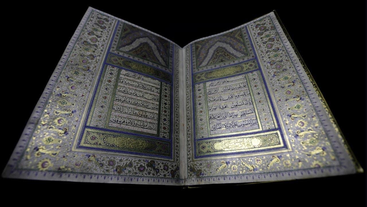 وتتميز صفحتها الأولى بزخارف نباتية مذهبة وملونة في تكوين فني بديع، تتوسطها سورة الفاتحة، بينما تتضمن الصفحة الثانية بداية سورة البقرة، في نموذج يعكس روعة فنون الزخرفة الإسلامية ودقة الخط العربي في تلك الحقبة.