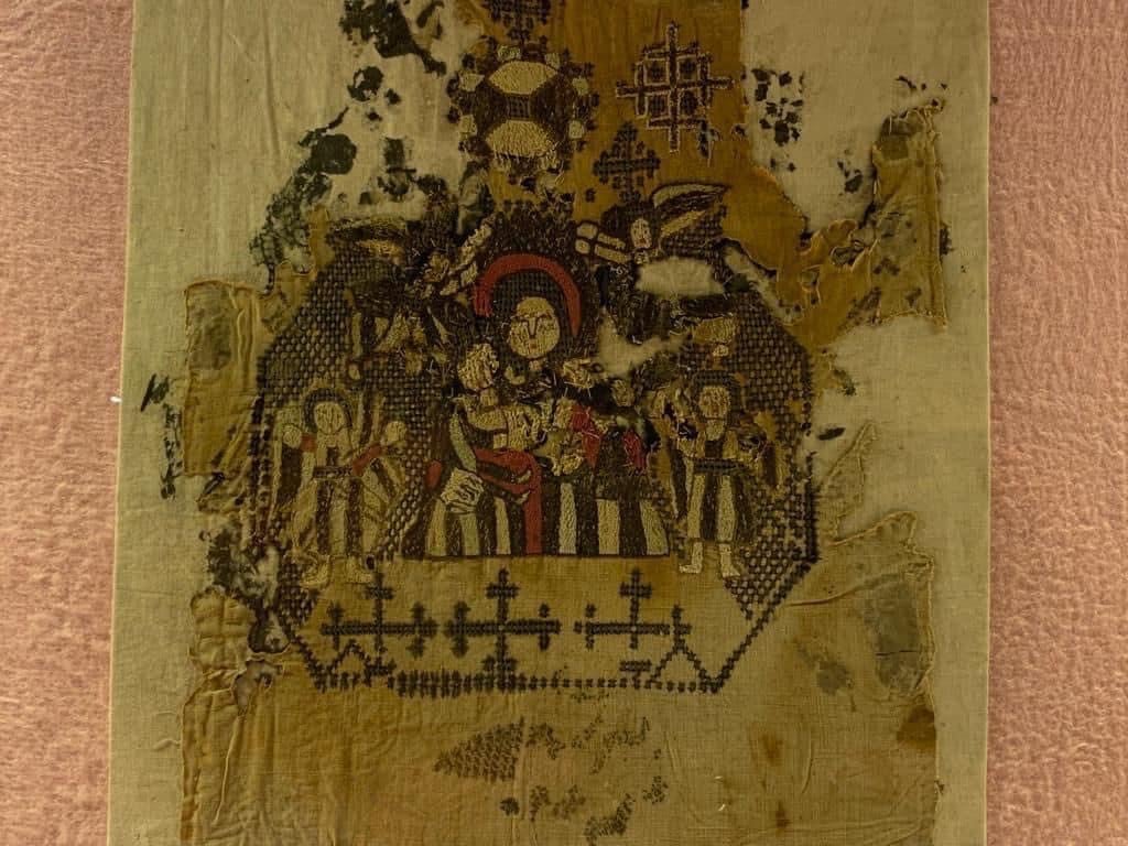 وفي قاعة الآثار القبطية، يعرض المتحف قطعة نسيج قبطي نادرة مصنوعة من الصوف والكتان، تتوسطها صورة للسيدة العذراء تحمل السيد المسيح طفلًا، وتحيط بهما الملائكة من أعلى، فيما يظهر في الجزء السفلي تصوير لقديس يرجح أنه مارمينا العجائبي رافعًا يديه، وعلى جانبيه شكلان حيوانيان يعتصد أنهما جملان، كما هو شائع في أيقوناته المعروفة، ويحيط بالمشهد زخارف هندسية ونباتية متعددة وأشكال متنوعة من الصلبان، بما يعكس براعة فناني العصر القبطي.