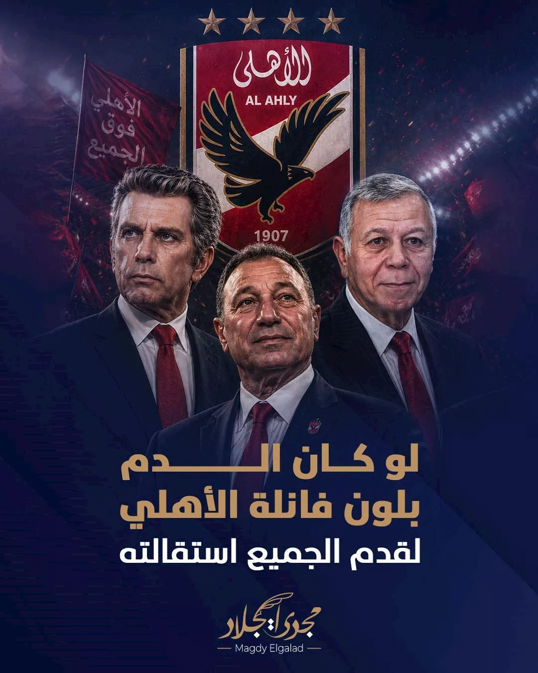 وشدد الكاتب الصحفي مجدي الجلاد، في ختام منشوره، على دعوته برحيل المنظومة الحالية، قائلاً: "امشوا.. وهاتوا لنا أهلي البطولات، والمبادئ، والتطبيق الفعلي لشعار "الأهلي فوق الجميع".. وليس شعار "المصلحة فوق الأهلي"..!".