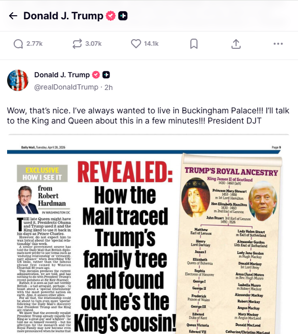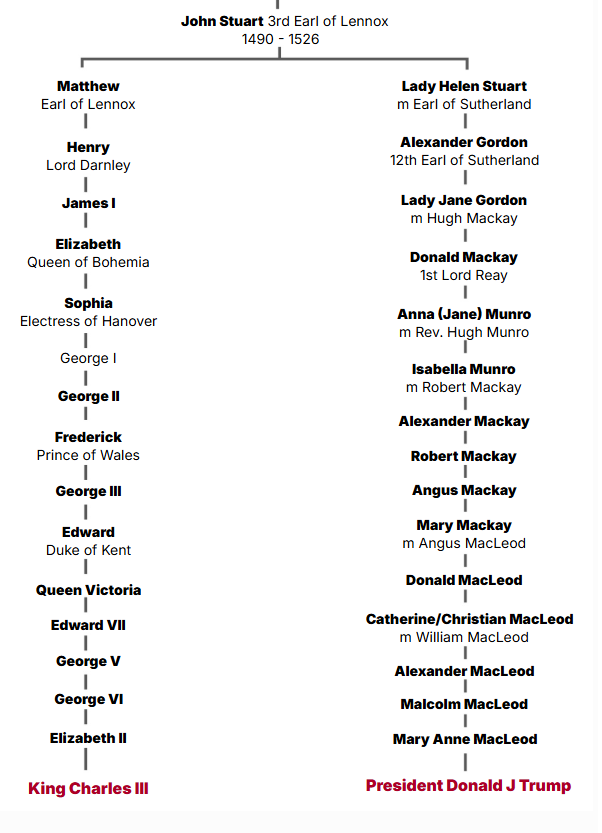 وأظهر بحثٌ مُفصّل أجرته الصحيفة أن كلا من ترامب وتشارلز لهما سلفاً مشتركاً هو إيرل لينوكس الثالث، حفيد الملك جيمس الثاني ملك اسكتلندا، موضحا أن سلفهم المشترك هذا لقي نهاية مؤسفة.