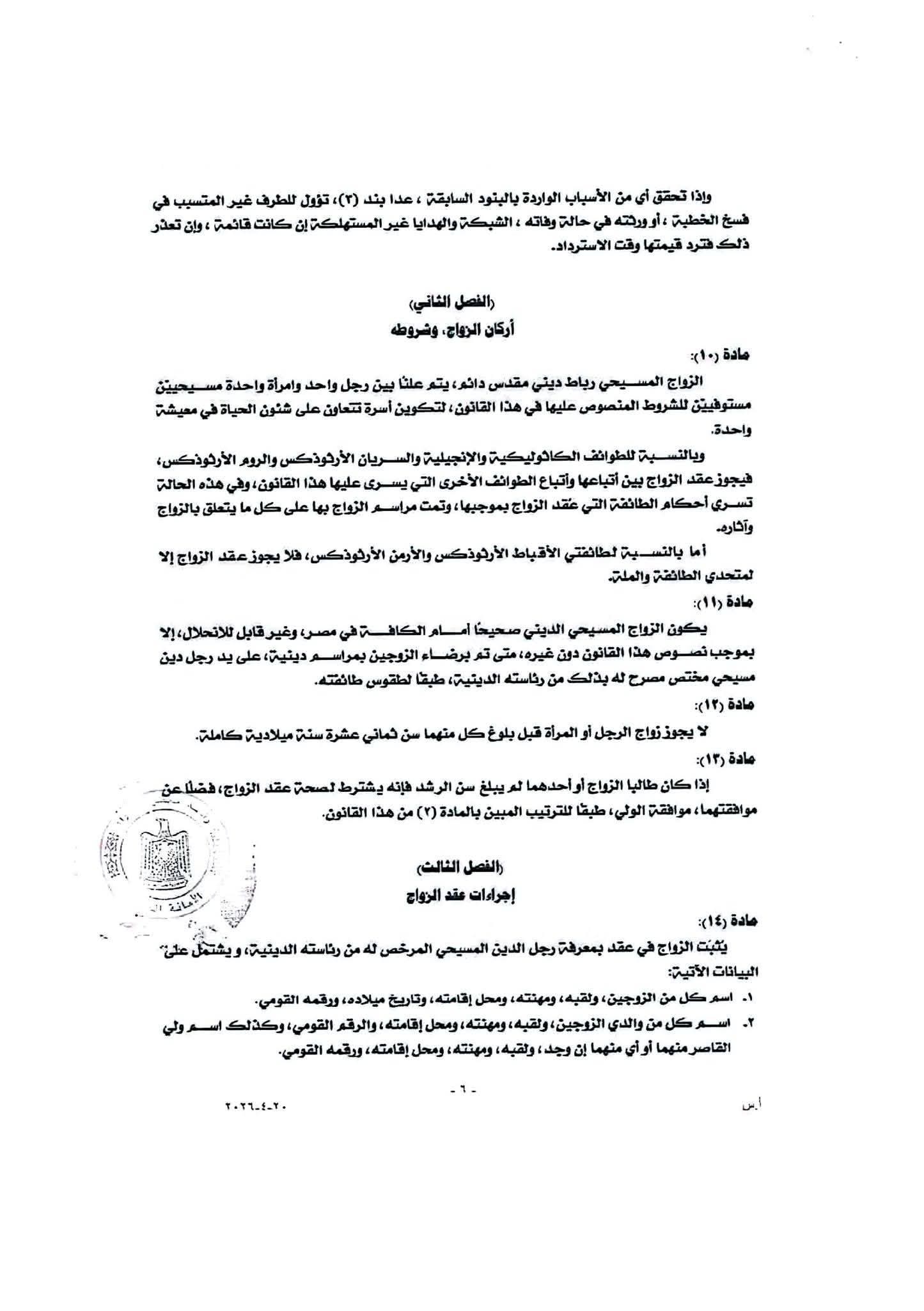 وأوضح القانون أن الطوائف الكاثوليكية والإنجيلية والسريانية والأرمنية تجيز الزواج بين أتباعها مع تطبيق شريعة الطائفة التي يتم فيها العقد، بينما شدد على أن الزواج في الكنائس الأرثوذكسية لا يجوز إلا بين متحدي الطائفة والملة، وهو ما يعكس تمسك الكنيسة الأرثوذكسية بخصوصيتها العقائدية.
