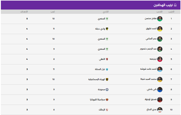انفرد صلاح محسن مهاجم فريق المصرى البورسعيدى بصدارة جدول ترتيب هدافى مسابقة الدورى المصرى الممتاز المصرى برصيد 5 أهداف عقب إقامة اليوم الجمعة 17 – 10 – 2025 3 مباريات من عمر البطولة حيث أستضاف غزل المحلة نظيره كهرباء الإسماعيلية والتقى إنبى مع المقاولون العرب وواجه مودرن سبورت فريق وادى دجلة.