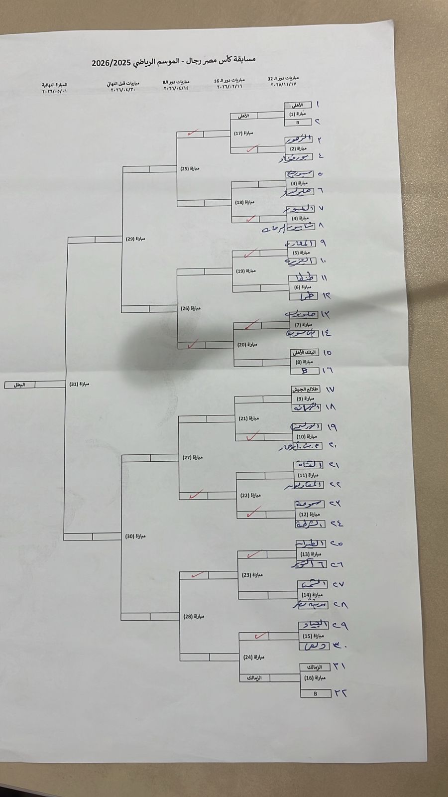 بينما أسفرت قرعة دور الـ 32 المحدد له يوم 17 نوفمبر 2025 عن مواجهات بين كل من، الزهور مع بور فؤاد و سبورتنج مع هليوليدو و العبور مع شامبيون الرحاب و المعادى مع الجزيرة و طنطا مع طما و هليوبوليس مع بنى سويف و طلائع الجيش مع الترسانة و الأوليمبى مع مركز شباب ابو حماد الشرقية و القناة مع المقاولون و سموحة مع اتحاد الشرطة و الطيران مع 6 أكتوبر و الشمس مع مدينة نصر و أصحاب الجياد مع دلفى.