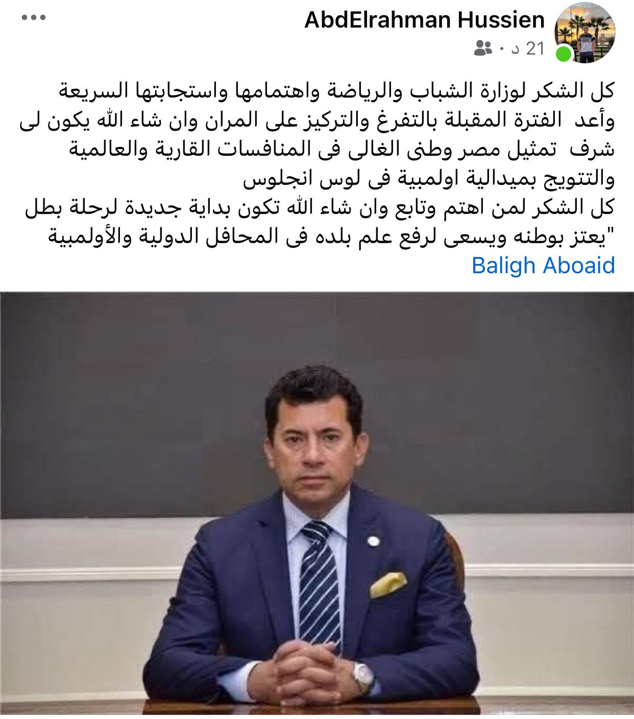 كل الشكر لوزارة الشباب والرياضة واهتمامها واستجابتها السريعة وأعد الفترة المقبلة بالتفرغ والتركيز على المران وان شاء الله يكون لى شرف تمثيل مصر وطنى الغالى فى المنافسات القارية والعالمية والتتويج بميدالية اولمبية في لوس أنجلوس كل الشكر لمن اهتم وتابع وان شاء الله تكون بداية جديدة لرحلة بطل " يعتز بوطنه ويسعى لرفع علم بلده فى المحافل الدولية والأولمبية.