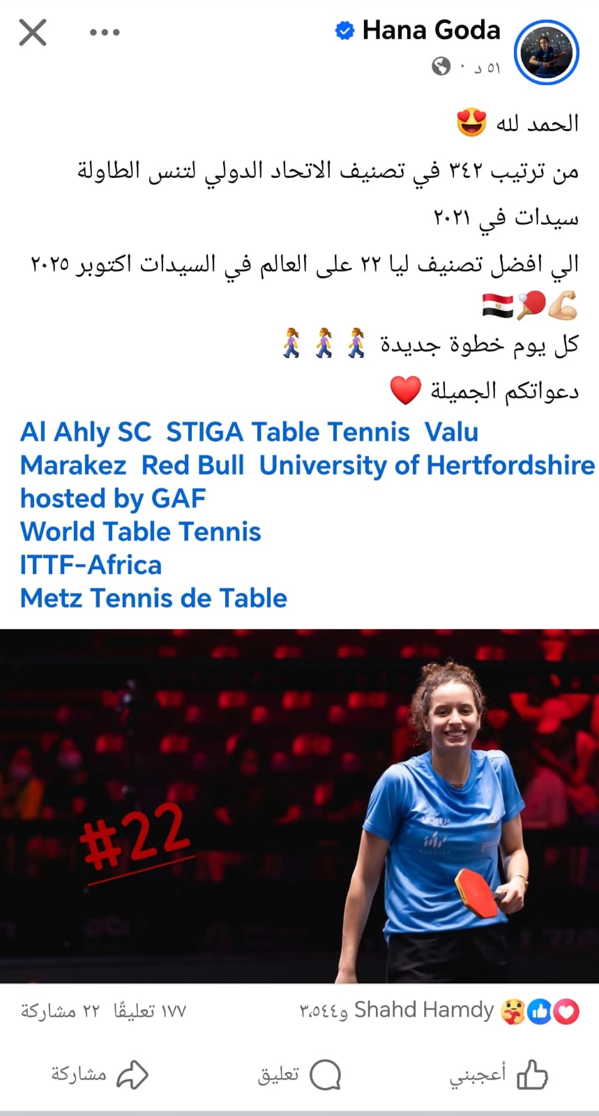 وكتب هنا جودة عبر حسابها على فيس بوك: الحمد لله من ترتيب 342 فى تصنيف الاتحاد الدولى لتنس الطاولة سيدات فى 2021، إلى أفضل تصنيف ليا 22 على العالم في السيدات أكتوبر 2025، كل يوم خطوة جديدة دعواتكم الجميلة.