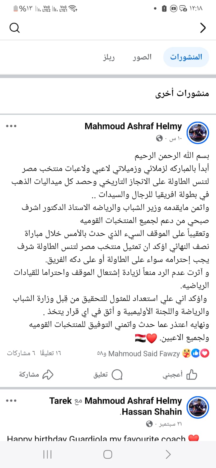 أبدأ بالمباركه لزملائي وزميلاتي لاعبي ولاعبات منتخب مصر لتنس الطاولة على الانجاز التاريخي وحصد كل ميداليات الذهب في بطولة افريقيا للرجال والسيدات .. واثمن مايقدمه وزير الشباب والرياضه الاستاذ الدكتور اشرف صبحي من دعم لجميع المنتخبات القوميه وتعقيباً على الموقف السيء الذي حدث بالأمس خلال مباراة نصف النهائي اؤكد ان تمثيل منتخب مصر لتنس الطاولة شرف يجب إحترامه سواء على الطاولة أو على دكه الفريق. و آثرت عدم الرد منعاً لزيادة إشتعال الموقف واحتراما للقيادات الرياضيه. واؤكد اني علي استعداد للمثول للتحقيق من قِبل وزارة الشباب والرياضة واللجنة الأوليمبية و أثق في اي قرار يتخذ . ونهايه اعتذر عما حدث واتمني التوفيق للمنتخبات القوميه ولجميع الاعبين.
