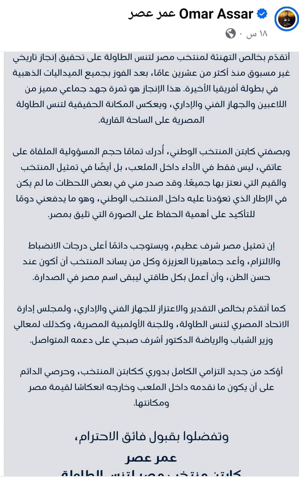 أتقدم بخالص التهنئة لمنتخب مصر لتنس الطاولة على تحقيق إنجاز تاريخي غير مسبوق منذ أكثر من عشرين عامًا، بعد الفوز بجميع الميداليات الذهبية في بطولة أفريقيا الأخيرة. هذا الإنجاز هو ثمرة جهد جماعي مميز من اللاعبين والجهاز الفني والإداري، ويعكس المكانة الحقيقية لتنس الطاولة المصرية على الساحة القارية. وبصفتي كابتن المنتخب الوطني، أدرك تمامًا حجم المسؤولية الملقاة على عاتقي، ليس فقط في الأداء داخل الملعب، بل أيضًا في تمثيل المنتخب والقيم التي نعتز بها جميعًا. وقد صدر مني في بعض اللحظات ما لم يكن في الإطار الذي تعوّدنا عليه داخل المنتخب الوطني، وهو ما يدفعني دومًا للتأكيد على أهمية الحفاظ على الصورة التي تليق بمصر. إن تمثيل مصر شرف عظيم، ويستوجب دائمًا أعلى درجات الانضباط والالتزام، وأعد جماهيرنا العزيزة وكل من يساند المنتخب أن أكون عند حسن الظن، وأن أعمل بكل طاقتي ليبقى اسم مصر في الصدارة. كما أتقدم بخالص التقدير والاعتزاز للجهاز الفني والإداري، ولمجلس إدارة الاتحاد المصري لتنس الطاولة، وللجنة الأولمبية المصرية، وكذلك لمعالي وزير الشباب والرياضة الدكتور أشرف صبحي على دعمه المتواصل. أؤكد من جديد التزامي الكامل بدوري ككابتن المنتخب، وحرصي الدائم على أن يكون ما نقدمه داخل الملعب وخارجه انعكاسا لقيمة مصر ومكانتها. وتفضلوا بقبول فائق الاحترام عمر عصر كابتن منتخب مصر لتنس الطاولة