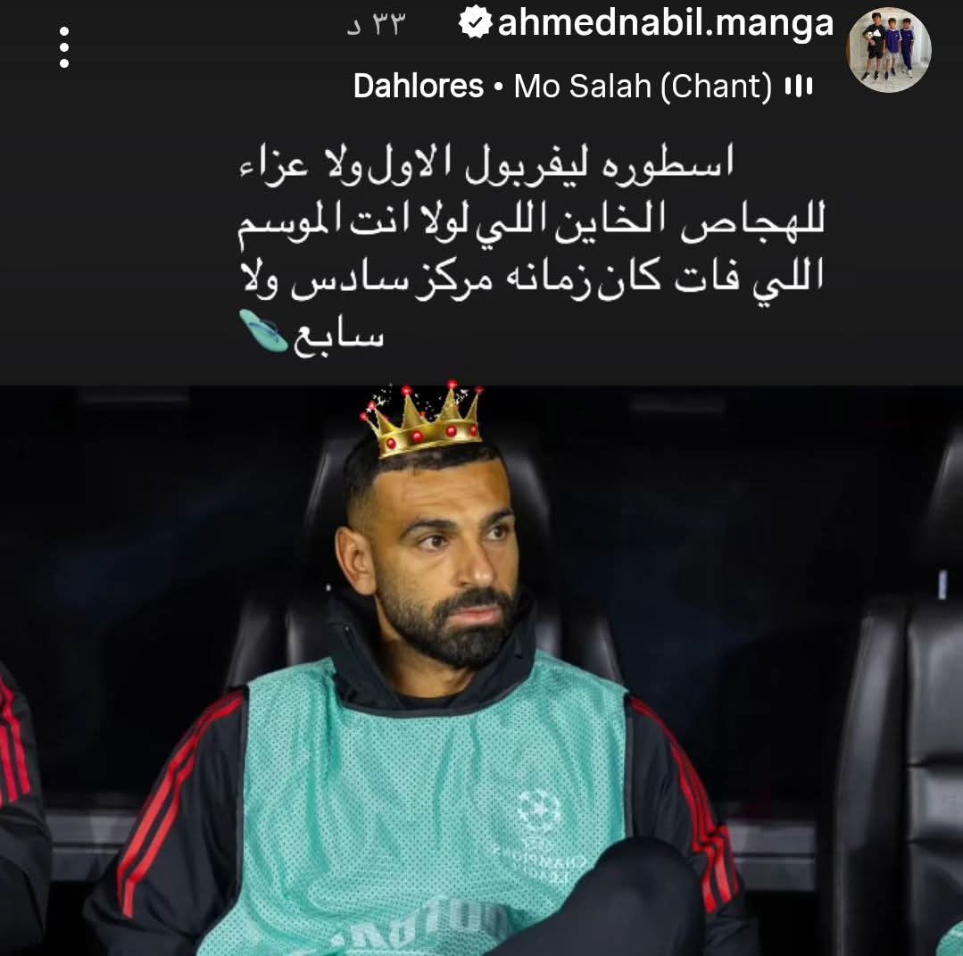 ونشر مانجا علي الاستوري الخاص به رسالة دعم لمحمد صلاح جاء نصها: "أسطورة ليفربول الأول، ولا عزاء للهجاص الخاين اللي لولا أنت الموسم اللي فات كان زمانه مركز سادس ولا سابع".
