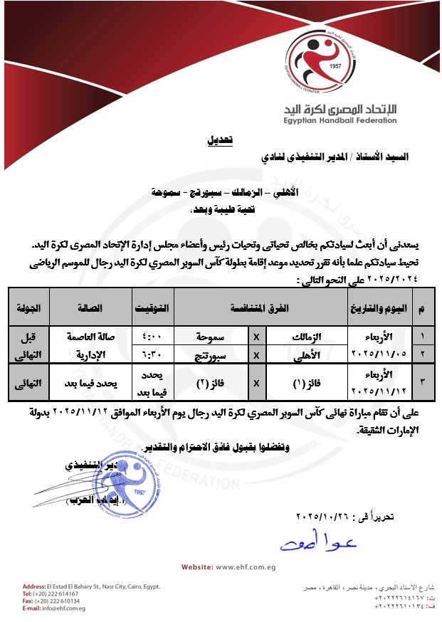 وأعلن اتحاد كرة اليد برئاسة خالد فتحي عن إقامة نهائي السوبر المصري في الإمارات 12 نوفمبر المقبل.