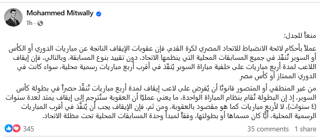 عملاً بأحكام لائحة الانضباط للاتحاد المصري لكرة القدم، فإن عقوبات الإيقاف الناتجة عن مباريات الدوري أو الكأس أو السوبر تُنفّذ في جميع المسابقات المحلية التي ينظمها الاتحاد، دون تقييد بنوع المسابقة. وبالتالي، فإن إيقاف اللاعب لمدة أربع مباريات على خلفية مباراة السوبر يُنفّذ في أقرب أربع مباريات رسمية محلية، سواء كانت في الدوري الممتاز أو كأس مصر..