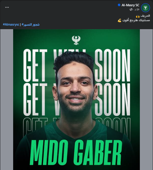 نشرت صفحة نادى المصرى البورسعيدى صورة للاعب الفريق ميدو جابر عقب تعرضه للإصابة وتأكيد غيابه عن مواجهة الأهلى في بطولة الدورى المصرى الممتاز. وجاء التعليق على الصورة كالتالى: الحريف.. مستنيينك هترجع أقوى.