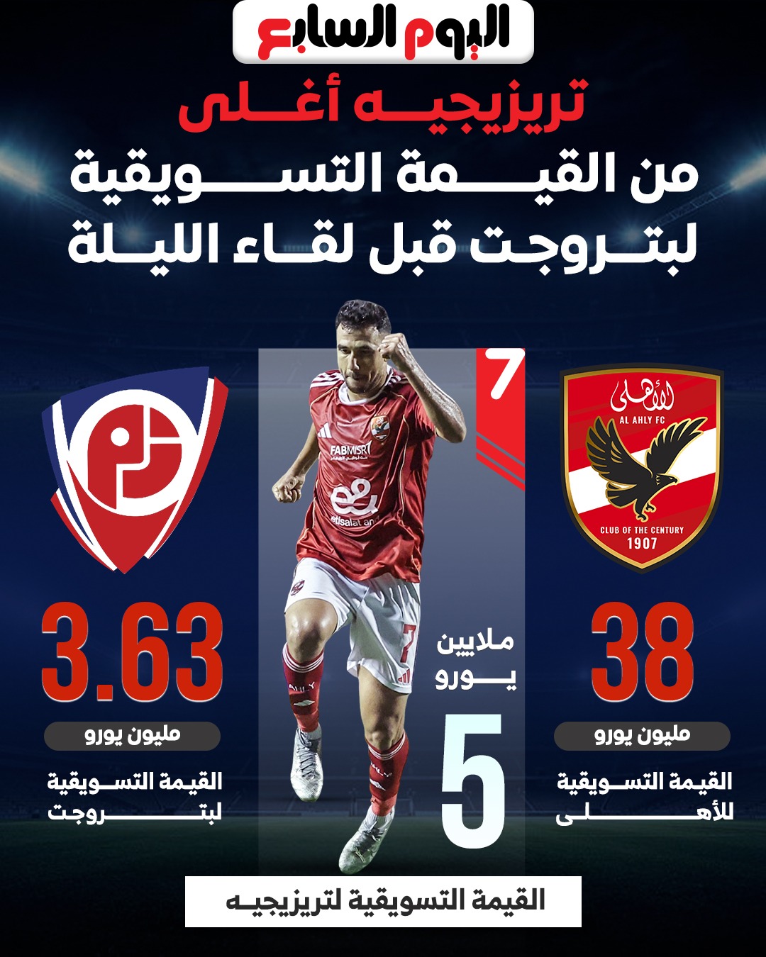 ويتفوق النادى الأهلى على فريق بتروجت في القيمة التسويقية، حيث بلغت قيمة الأهلي 38 مليون يورو، في حين تصل قيمة بتروجيت 3.63 مليون يورو، والذى تعد أقل من القيمة التسويقية لتريزيجيه التي تبلغ 5 ملايين يورو.