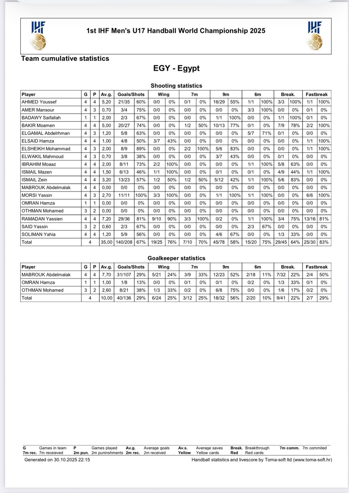يتربع ياسين رمضان، لاعب منتخب ناشئي كرة اليد مواليد 2008، على صدارة هدافي أحفاد الفراعنة مسجلا 29 هدفاً خلال مشوار التأهل لمواجهة ألمانيا مساء اليوم فى نهائي بطولة العالم بالمغرب.