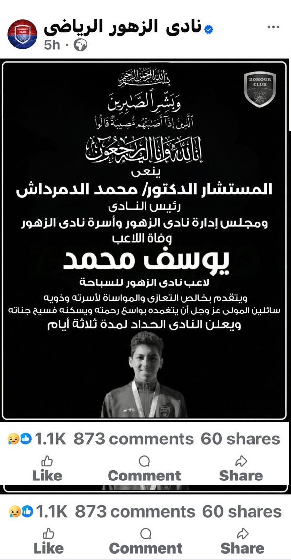 وكان مجلس إدارة الاتحاد المصري للسباحة، برئاسة المهندس ياسر إدريس، نعى اللاعب يوسف محمد لاعب نادي الزهور، الذي وافته المنية عقب نقله إلى إحدى المستشفيات بالقاهرة، وذلك بعد تعرضه لحالة إغماء خلال مشاركته في منافسات بطولة الجمهورية تحت 12 سنة المقامة حاليًا بمجمع حمامات السباحة باستاد القاهرة الدولي.